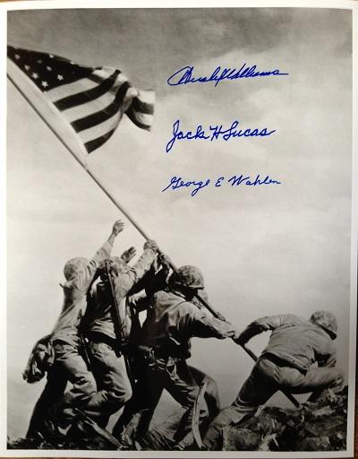 One of the most FAMOUS PHOTOS in history- here is a LARGE, 11″X14″ B/W photo of THREE “MEDAL OF HONOR” winners from this epic battle! Perfect 11″X 14″ autographed by HERSHEL WILLIAMS, JACK LUCAS (D) & GEORGE WAHLEN! This one is a winner!